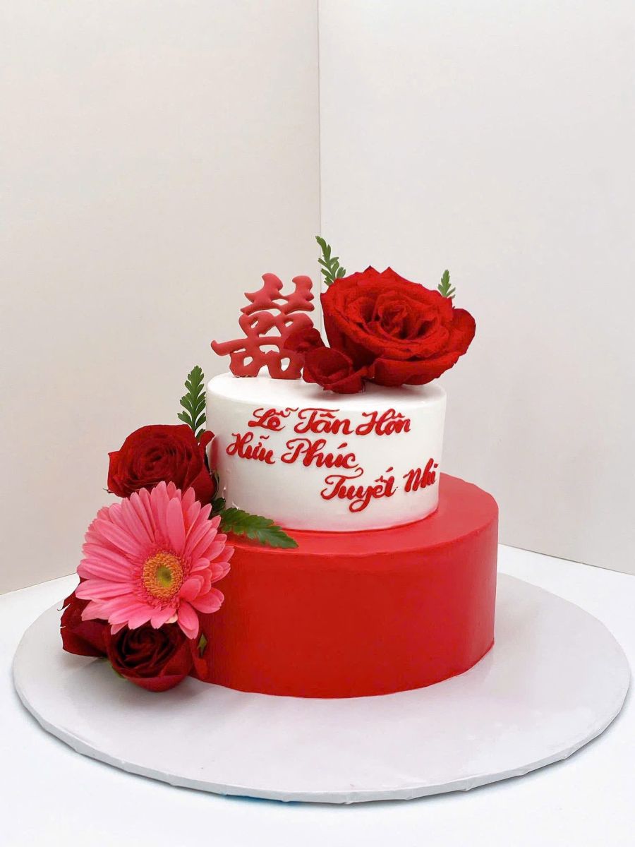 Tone đỏ luôn là biểu tượng của tình yêu, may mắn và hạnh phúc. Các mẫu bánh cưới tone đỏ thường được kết hợp với hoa tươi để tăng thêm phần nổi bật.